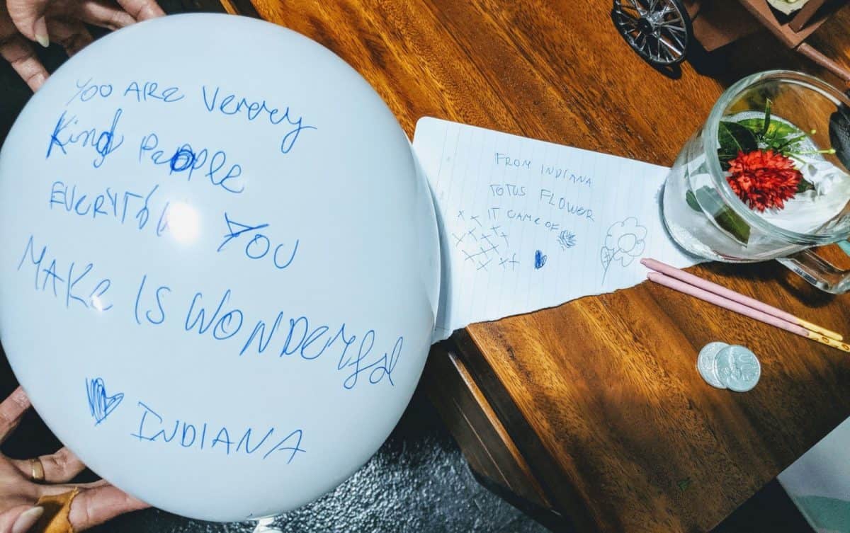 The glass holds some lotus flower petals that fell to the ground. Indiana recycled them into the glass, along with another flower, as part of her gift to us.