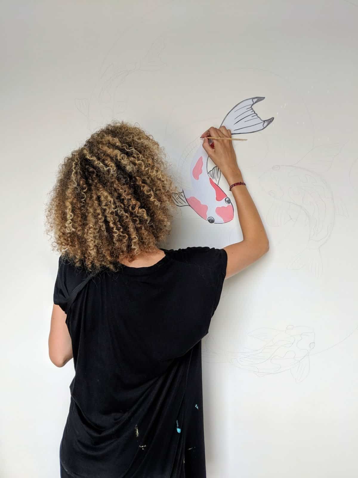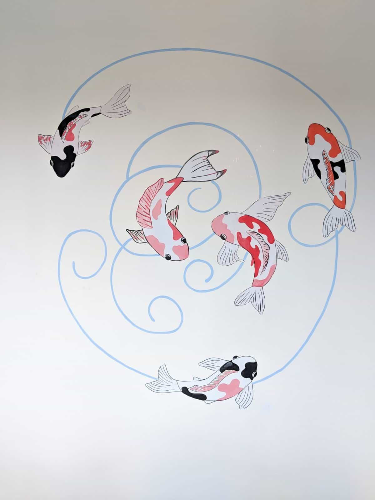 Above, the amazing mural artist Maria @_mary_cherry (Instagram) has been painting plants and flowers and birds and is now trying her hand at koi fish, as we are installing a koi pond.