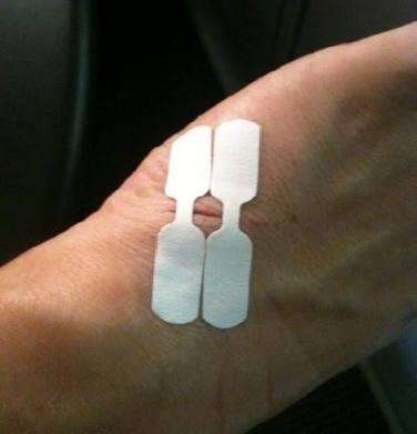 I had a nice but small gash below my left knee, and then Shelly went looking for stitch bandaids, but of course there’s none for sale in Bali, even at upstanding pharmacies such as The Guardian. Anyway, this is what a stitch bandaid looks like: